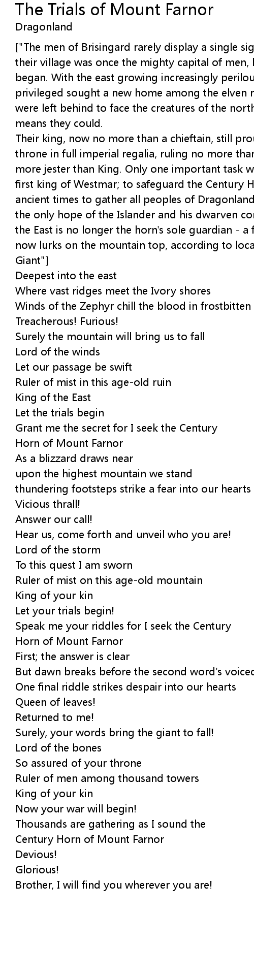 Their king, now no more than a chieftain, still proudly sits upon the golden throne in full imperial regalia, ruling no more than a few hundred and seems more jester than King. Only one important task was left to his line by Ethil I, first king of Westmar; to safeguard the Century Horn of Mount Farnor, built in ancient times to gather all peoples of Dragonland once blewn into. And such is the only hope of the Islander and his dwarven companion, but the vain King of the East is no longer the horn's sole guardian - a foul beast, unseen by any man now lurks on the mountain top, according to local lore; a fabled savage Frost Giant"] |