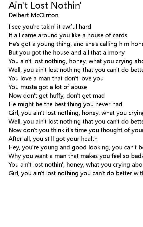 Girl, you ain't lost nothing, honey, what you crying about? |