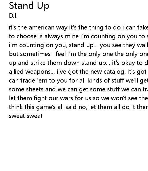 it's the american way it's the thing to do i can take anything i want the right to choose is always mine i'm counting on you to stand up and strike them down i'm counting on you, stand up... you see they walk the streets they kill for fun but sometimes i feel i'm the only one the only one i'm counting on you to stand up and strike them down stand up... it's okay to die no, no! strike force, allied weapons... i've got the new catalog, it's got all the neat new guns we can trade 'em to you for all kinds of stuff we'll get some weed or some feds get some sheets and we can get some stuff we can trade you all kinds of fire power let them fight our wars for us so we won't see the state blow up cuz you really think this game's all said no, let them all do it there so we don't have to sweat sweat |