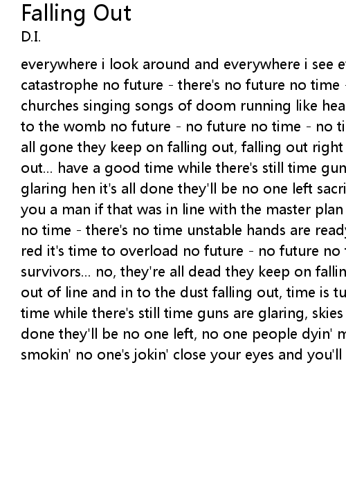 everywhere i look around and everywhere i see everyone's hysterical a mass catastrophe no future - there's no future no time - there's no time celebration, churches singing songs of doom running like headless chickens as they reproduce to the womb no future - no future no time - no time no survivors... no, they're all gone they keep on falling out, falling out right in to the dust falling out... have a good time while there's still time guns are glaring, skies are glaring hen it's all done they'll be no one left sacrifice the world gonna make you a man if that was in line with the master plan no future - there's no future no time - there's no time unstable hands are ready to explode the light turns red it's time to overload no future - no future no time - no time no survivors... no, they're all dead they keep on falling out, falling out, falling out of line and in to the dust falling out, time is turning to rust have a good time while there's still time guns are glaring, skies are glaring when it's all done they'll be no one left, no one people dyin' mother's cryin' last word's smokin' no one's jokin' close your eyes and you'll be over blow yourself away |