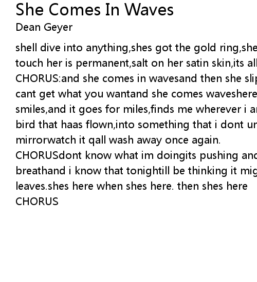CHORUS:and she comes in wavesand then she slips awayand i wish shed staybut you cant get what you wantand she comes waveshere she comesshes pretty when she smiles,and it goes for miles,finds me wherever i am.then i wake up alone.like a bird that haas flown,into something that i dont understand.check the rearview mirrorwatch it qall wash away once again. |