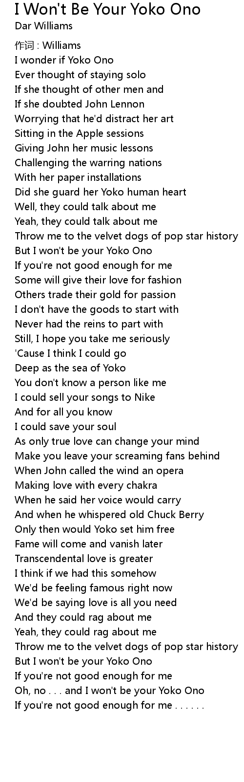 | But I won' t be your Yoko Ono | |