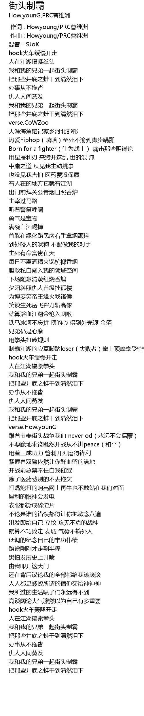 | [01:56.449] | 跟着节奏街头战争我们 never od(永远不会搞蒙) |