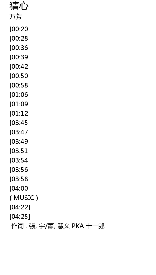 | [00:00.00] | 作词 : 張, 宇/蕭, 慧文 PKA 十一郎 |