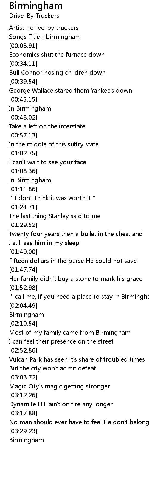 | [03:18.81] | No man should ever have to feel He don't belong in Birmingham |