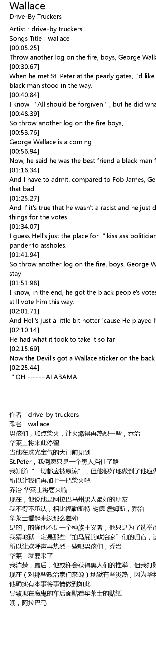 | [00:23.37] | Throw another log on the fire, boys, George Wallace is coming to stay |