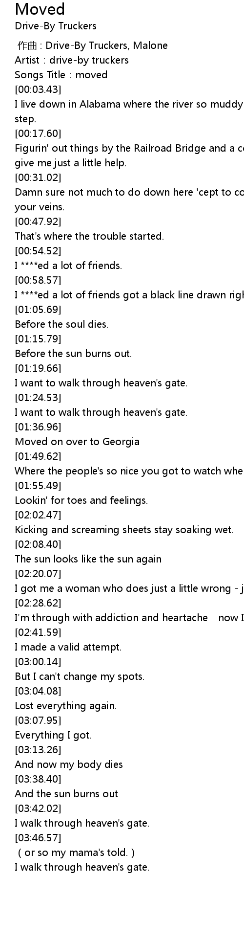| [00:00.00] | 作曲 : Drive-By Truckers, Malone |