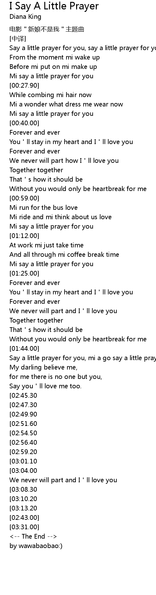 | [00:36.80] | Mi say a little prayer for you |