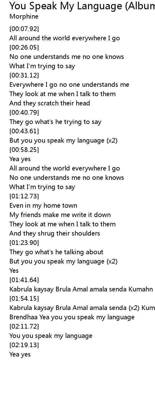 [01:54.96] Kabrula kaysay Brula Amal amala senda (x2) Kumahn Brendhaa (x2) Brendhaa Yea you you speak my language