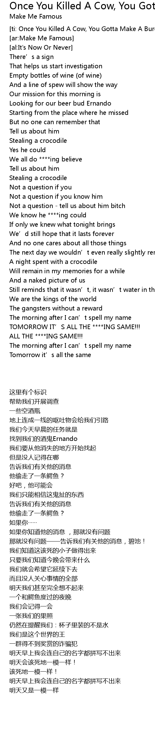 | Song | Once You Killed A Cow, You Gotta Make A Burger |