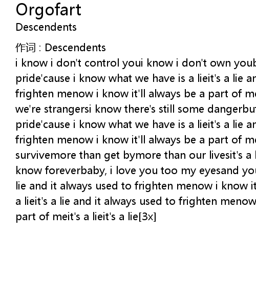 | [3x] | i know i don' t control youi know i don' t own youbut i still feel a sense of pride' cause i know what we have is a lieit' s a lie and it always used to frighten menow i know it' ll always be a part of meit' s a liei know sometimes we' re strangersi know there' s still some dangerbut i still feel a sense of pride' cause i know what we have is a lieit' s a lie and it always used to frighten menow i know it' ll always be a part of meit' s a liea lie more than survivemore than get bymore than our livesit' s a liei know we' ll be togetheri know foreverbaby, i love you too my eyesand you know what we have is a lieit' s a lie and it always used to frighten menow i know it' ll always be a part of meit' s a lieit' s a lie and it always used to frighten menow i know it' ll always be a part of meit' s a lieit' s a lie |