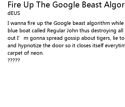 | I wanna fire up the Google beast algorithm while dreaming of Vietnam on a light blue boat called Regular John thus destroying all evidence from a mediocre night out I' m gonna spread gossip about tigers, lie to taxi drivers about my address and hypnotize the door so it closes itself everytime I fly through it on a carpet of neon. | |