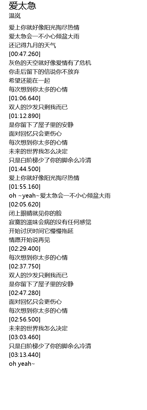 | [01:56.800] | oh ~yeah~爱太急会一不小心倾盆大雨 |
