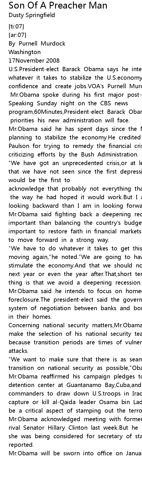| [00:29.637]"We have got an unprecedented crisis,or at least something that we have not seen since the first depression,"Obama said."And I think Hank U.S.Treasury Secretary Henry Paulson] |