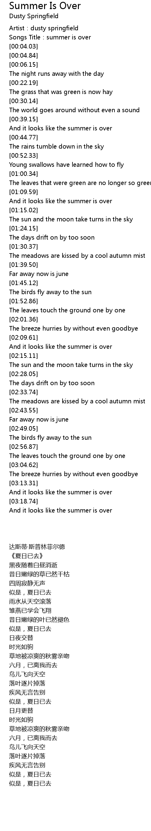 | [01:32.93] | The meadows are kissed by a cool autumn mist |
