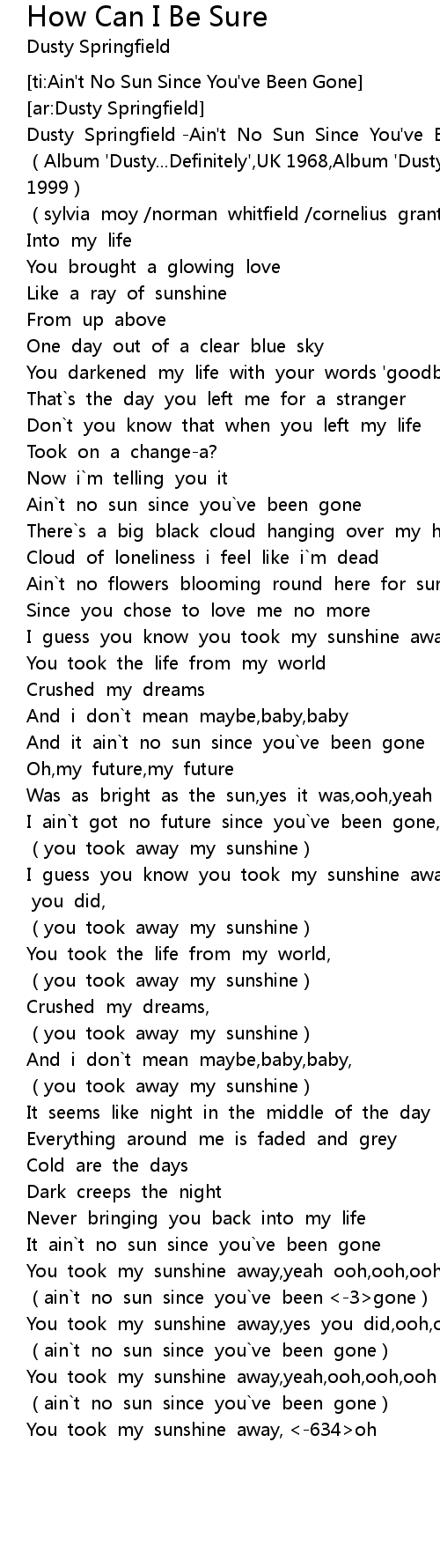 | [00:03.38] | Dusty Springfield Ain' t No Sun Since You' ve Been Gone |