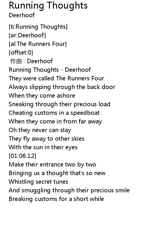 | [00:05.34] | Running Thoughts - Deerhoof |