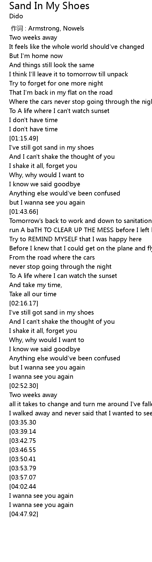 | [04:05.53][03:35.30] | I' ve still got sand in my shoes |
