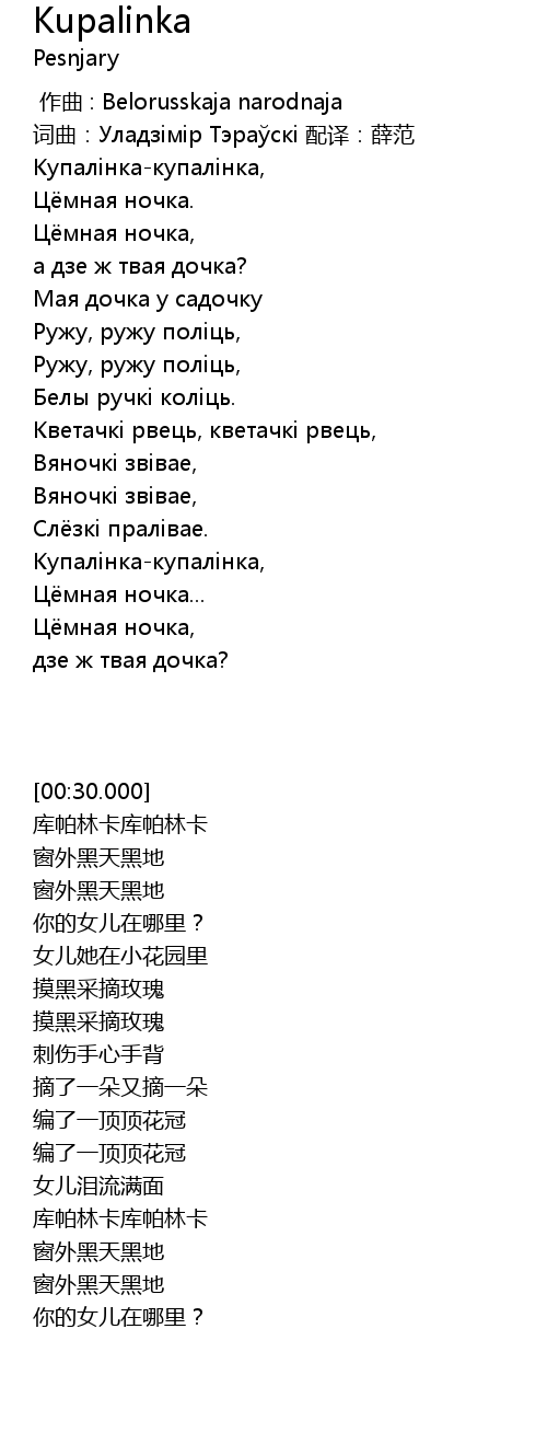| [00:30.000] | 词曲:Уладзімір Тэраўскі 配译:薛范 |