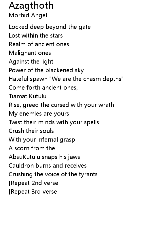 Raise the horns in blasphemy[Repeat 2nd verse][Repeat 2nd verse][Repeat 2nd verse][Repeat 3rd verse][Repeat 2nd verse]
