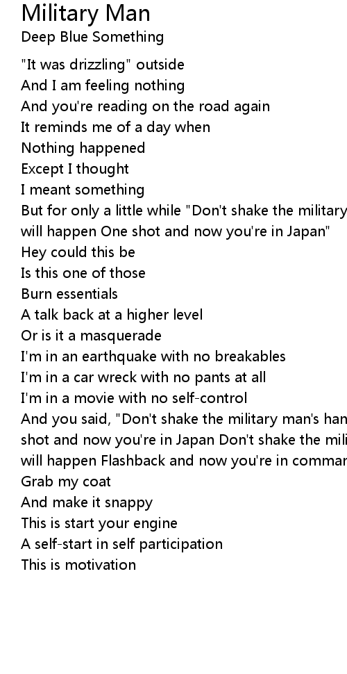 And you said, "Don't shake the military man's hand You know what will happen One shot and now you're in Japan Don't shake the military man's hand You know what will happen Flashback and now you're in command" |