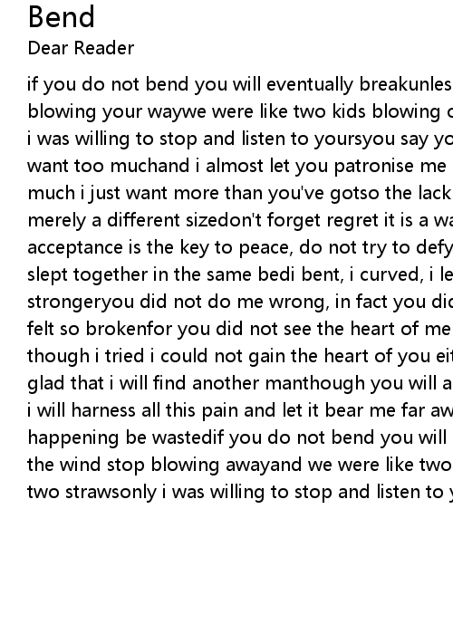if you do not bend you will eventually breakunless you make the wind stop blowing your waywe were like two kids blowing on each other with two strawsonly i was willing to stop and listen to yoursyou say you do not want me because i want too muchand i almost let you patronise me one last timebut i don't want too much i just want more than you've gotso the lack is not with either, we are merely a different sizedon't forget regret it is a waste of an emotionand acceptance is the key to peace, do not try to defy herno i'm not sad we met and slept together in the same bedi bent, i curved, i lent, i learnt, i'm strongeryou did not do me wrong, in fact you did me rightto let me go although i felt so brokenfor you did not see the heart of me - perhaps you were too lazyand though i tried i could not gain the heart of you eitherso now its done and i am glad that i will find another manthough you will always be the first i tastedand i will harness all this pain and let it bear me far awayi would not let this happening be wastedif you do not bend you will eventually breakunless you make the wind stop blowing awayand we were like two kids blowing on each other with two strawsonly i was willing to stop and listen to yours |