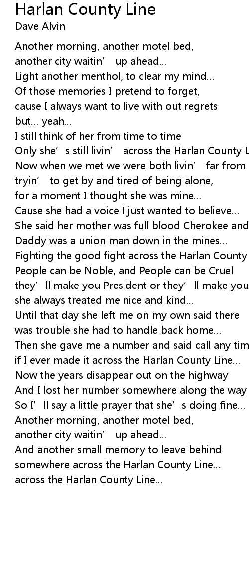 | Only she’s still livin’ across the Harlan County Line | |