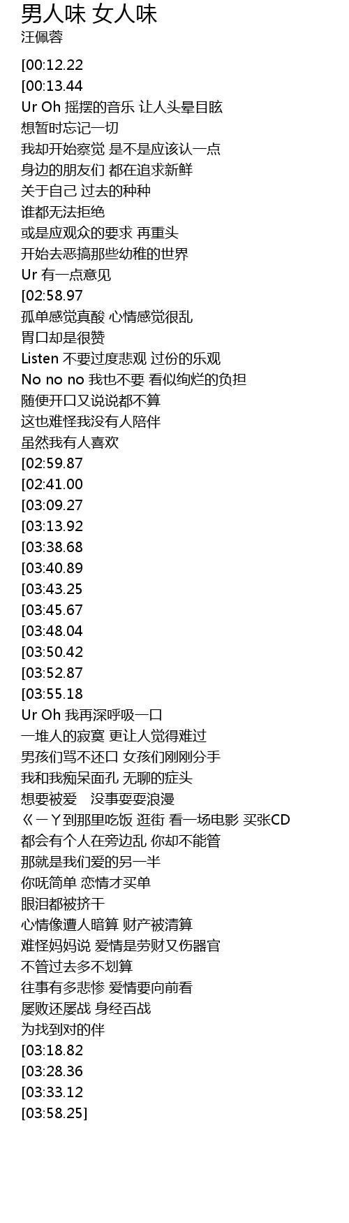 | [01:02.98][02:41.00][03:05.22][03:24.03] | 有查埔人的味 有查埔人的味 |