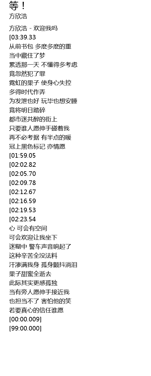 | [00:00.41] | 方欣浩 - 欢迎我吗 |