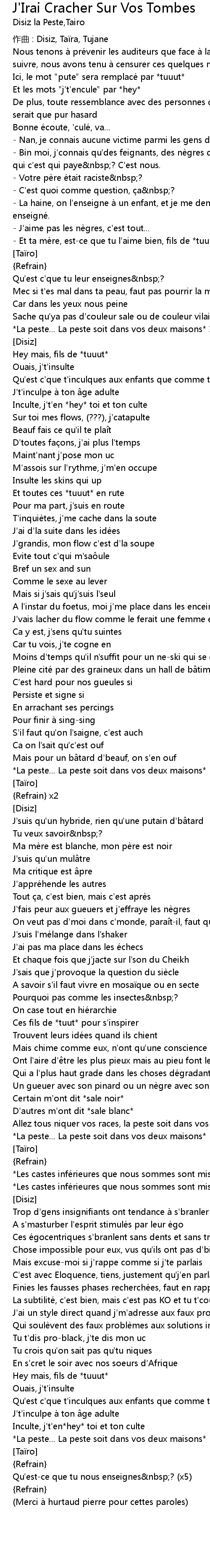 | Nous tenons à pré venir les auditeurs que face à la virulence du texte qui va suivre, nous avons tenu à censurer ces quelques mots nbsp: | |