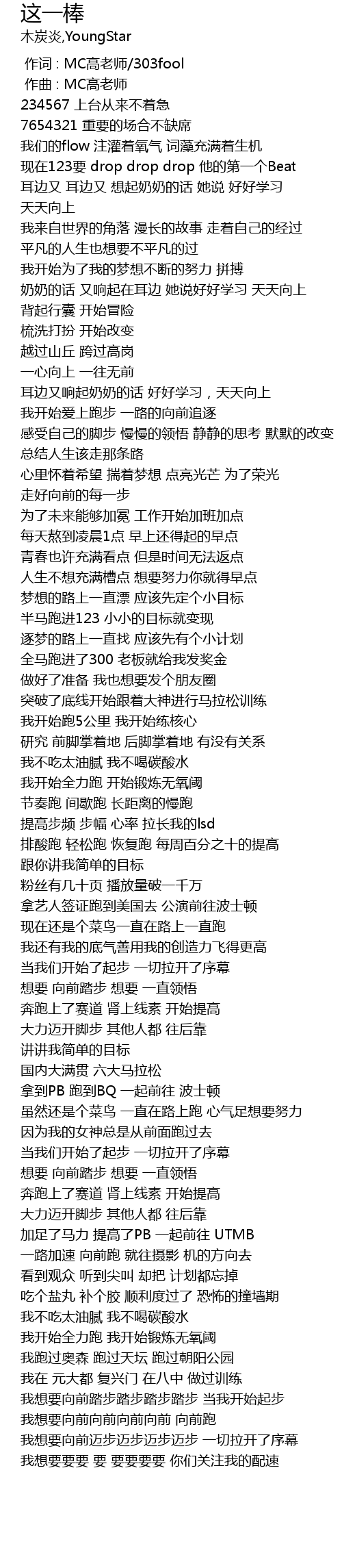 | [03:16.100] | 我想要要要 要 要要要要 你们关注我的配速 |
