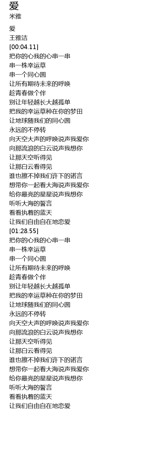 | [00:55.83] | xiang tian kong da sheng de hu huan shuo sheng wo ai ni |