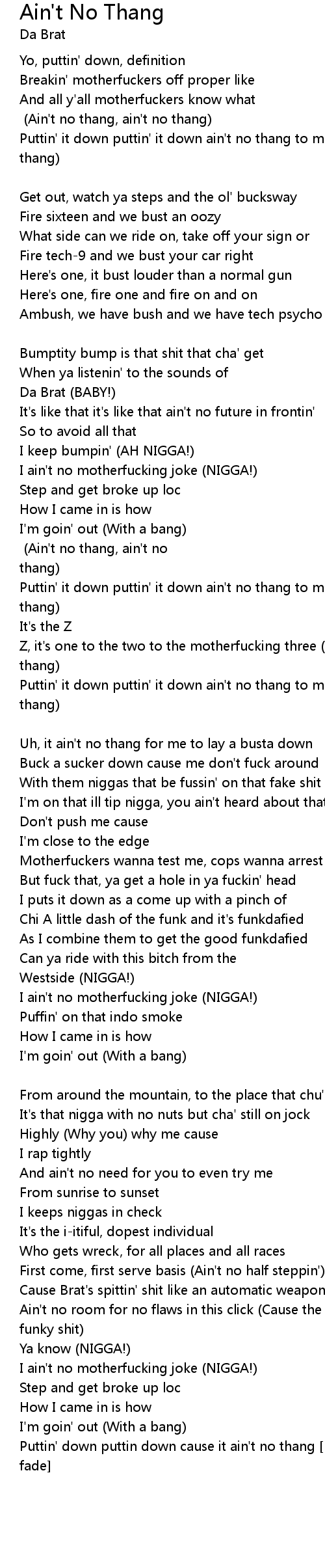 Puttin' down puttin down cause it ain't no thang [Hook with ad-libs repeated to fade] |