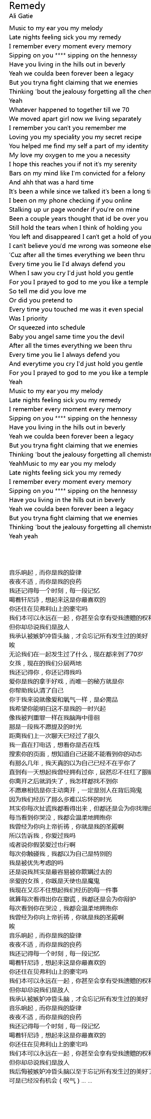 | [01:58.37] | Late nights feeling sick you my remedy |