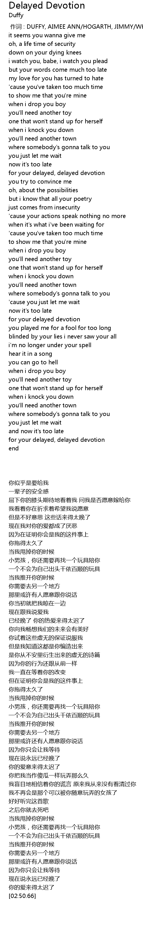 | [00:00.00] | 作词 : DUFFY, AIMEE ANN/HOGARTH, JIMMY/WHITE, EG |