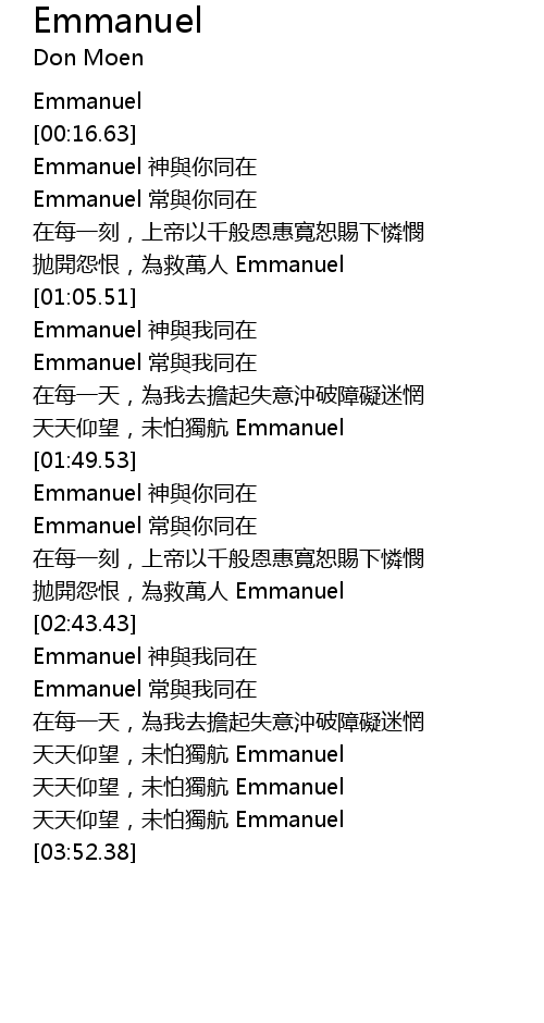 | [00:22.35] | Emmanuel shén yǔ nǐ tóng zài |