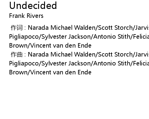 | [00:00.000] | 作曲 : Narada Michael Walden/Scott Storch/Jarvis Baker/Patrizio Pigliapoco/Sylvester Jackson/Antonio Stith/Felicia Ferraro/Christopher Maurice Brown/Vincent van den Ende |