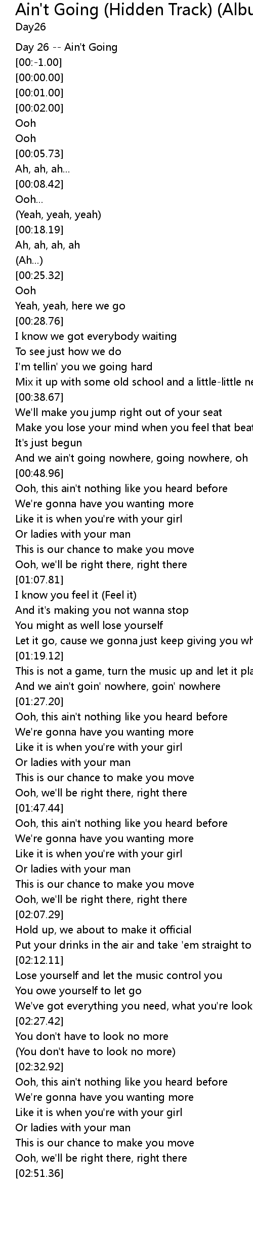 | [01:25.02] | And we ain't goin' nowhere, goin' nowhere |