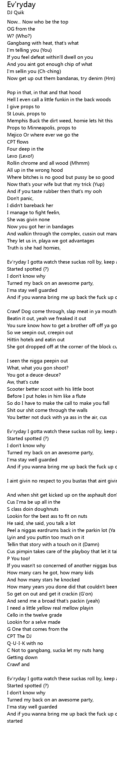 | Ev'ryday I gotta watch these suckas roll by, keep an eye on they | |