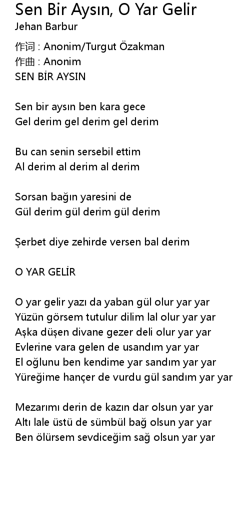 | Song | Sen Bir Aysın, O Yar Gelir |