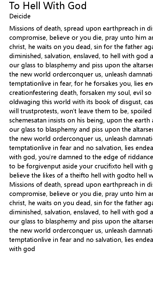 Missions of death, spread upon earthpreach in disguise of a god and his churchno compromise, believe or you die, pray unto him and to follow his liesbuy into christ, he waits on you dead, sin for the father again and againfalter, diminished, salvation, enslaved, to hell with god and to all that he gaveraise our glass to blasphemy and piss upon the altarservants of the lord above, ignore the new world orderconquer us, unleash damnation, go from here into temptationlive in fear, for he forsakes you, lies endeared for all creationfestering death, forsaken my soul, evil so ancient from elders of oldwaging this world with its book of disgust, casting its will upon all who will trustprotests, won't leave them to be, spoiled by god and his beautiful schemesatan insists on his being, upon the earth and emplaced overseeingraise our glass to blasphemy and piss upon the altarservants of the lord above, ignor the new world orderconquer us, unleash damnation, go from here into temptationlive in fear and no salvation, lies endeared for all creationto hell with god, you're damned to the edge of riddanceto hell with god, you don't want to be forgivenput aside your crucifixto hell with god, him and his son, do not believe the likes of a theifto hell with godto hell with godto hell with god |