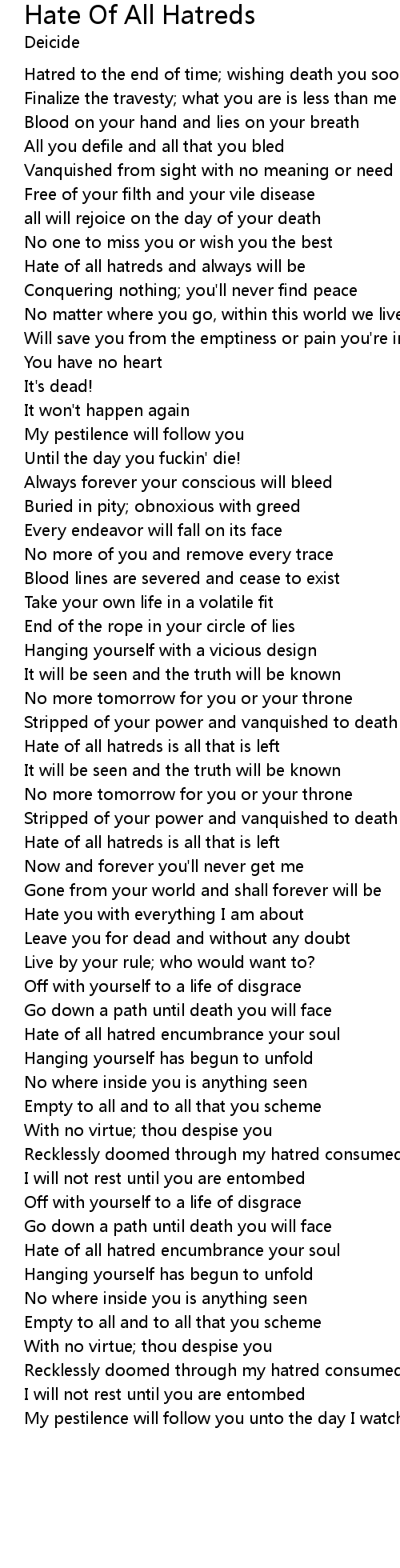 Hatred to the end of time; wishing death you soon will find |