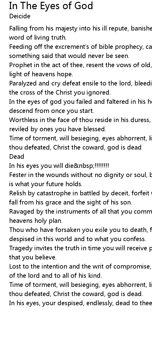 Time of torment, will besieging, eyes abhorrent, life depleting, lies devoured, thou defeated, Christ the coward, god is dead.