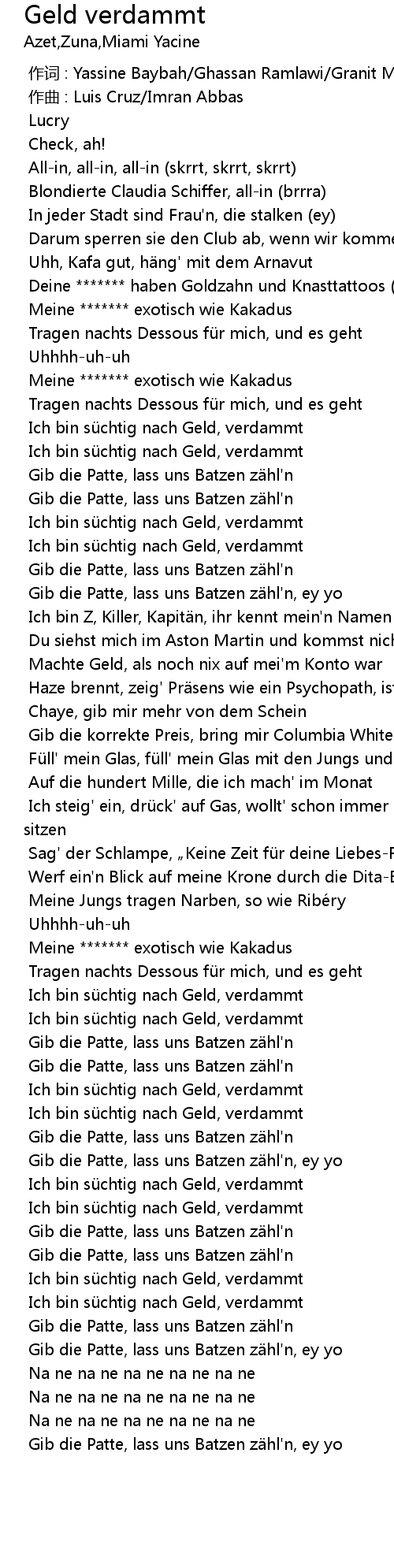 | [01:35.202] | Ich bin sü chtig nach Geld, verdammt |