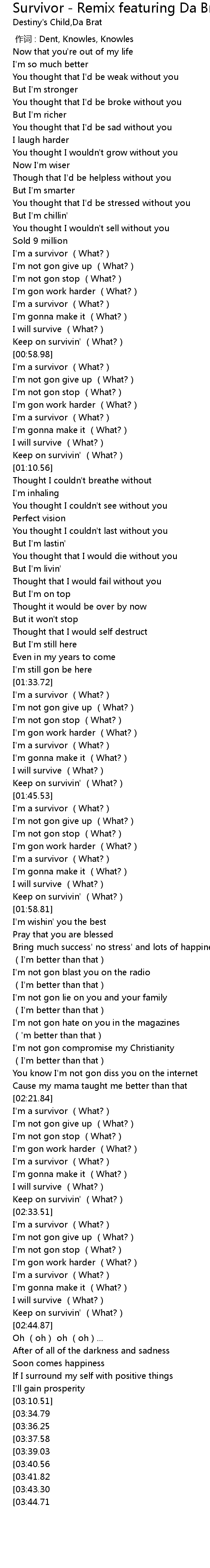 | [03:47.01][03:34.79][03:22.70][03:11.10] | I' m a survivor What? |