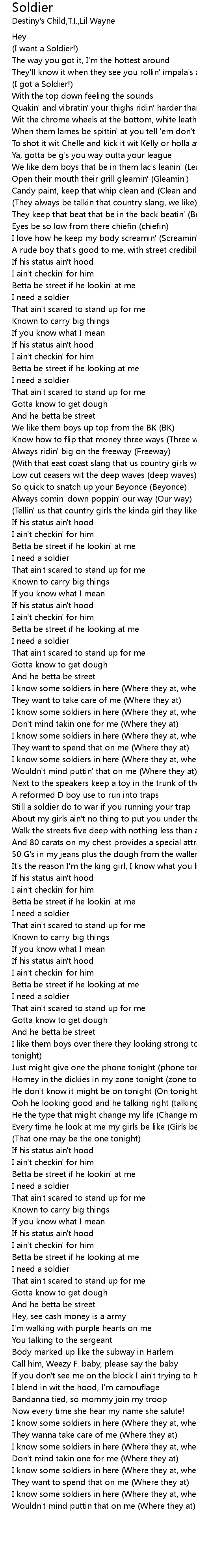 | [02:18.24] | I know some soldiers in here (Where they at, where they at) |
