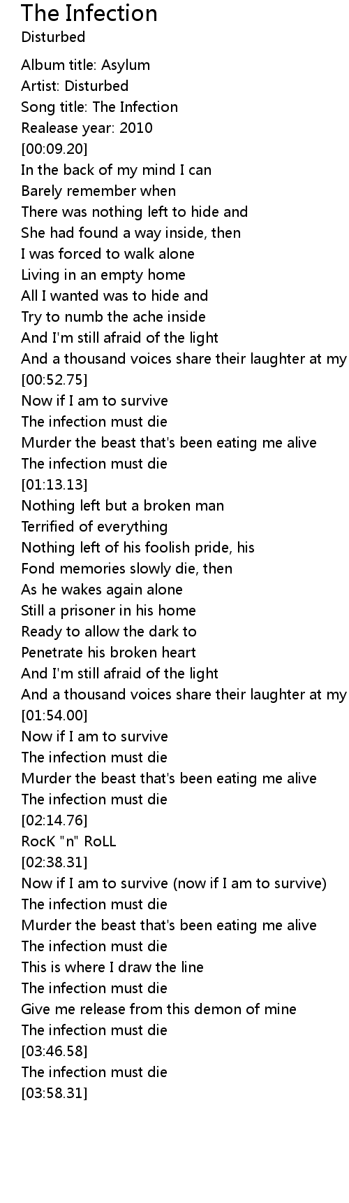 | [03:32.01] | The infection must die |