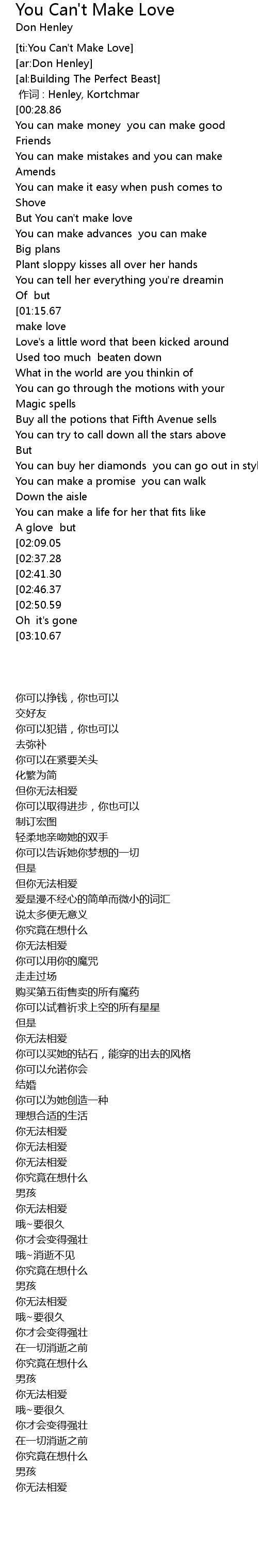 | [02:06.82][02:09.05][02:13.47] | You can' t make love |