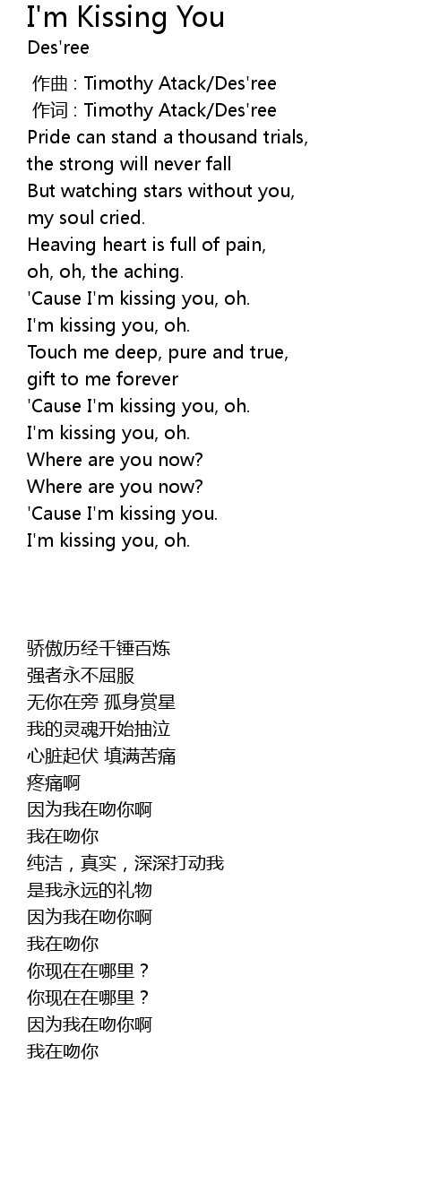 | [01:30.38] | 'Cause I'm kissing you, oh. |