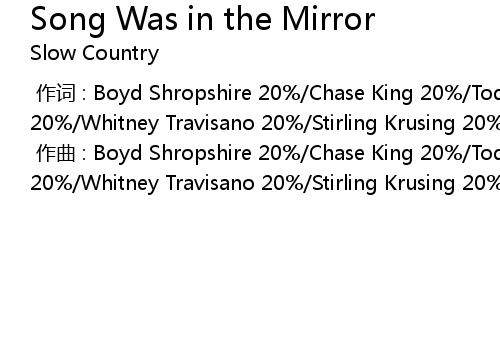 | [00:00.000] | 作曲 : Boyd Shropshire 20%/Chase King 20%/Todd Weissfeld 20%/Whitney Travisano 20%/Stirling Krusing 20% |